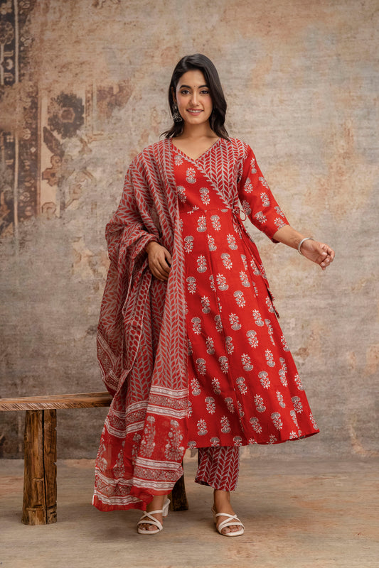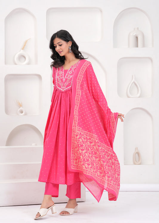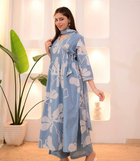 Elegant Floral Print Cotton Kurta Pant Dupatta Set.