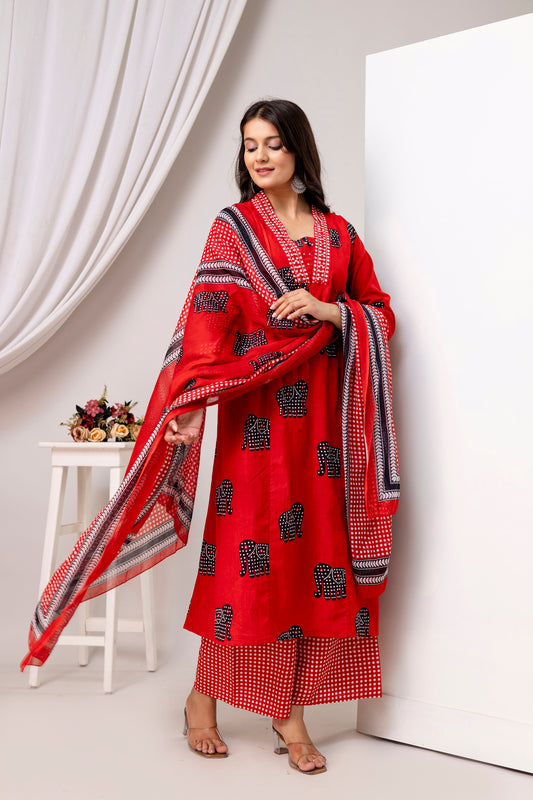 Poshart Hathi Print Cotton Kurta Pant Duptta Set.