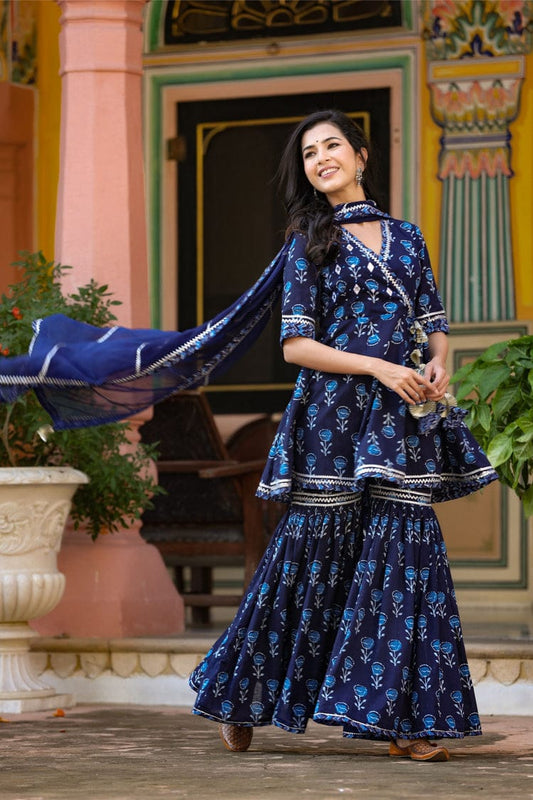 PoshArt's Indigo Blue Printed Sharara Set With Dupatta