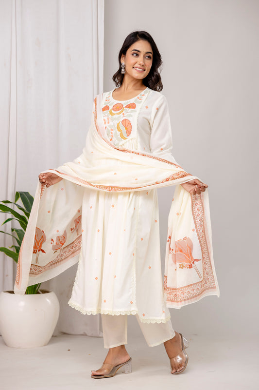 Poshart White Printed Cotton Kurta Pant duptta Set