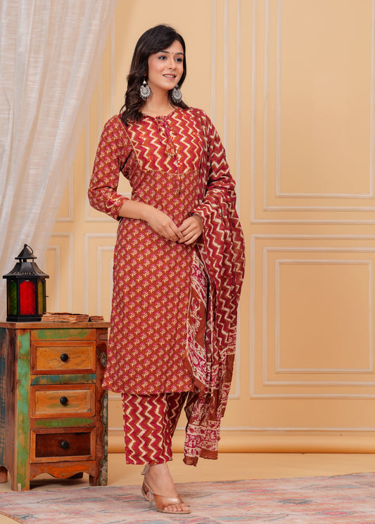 PoshArt's New Maroon Comfy Cotton Kurta Set With Dupatta